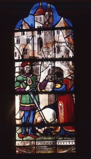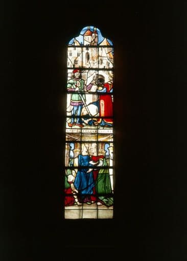 verrière de la baie 6 : le Bourreau présentant la tête de saint Jean-Baptis- te à Salomé, la Visitation (ensemble de 3 verrières historiées)