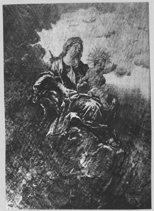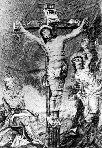 L'une des tapisseries représente le Christ en croix entre saint Joseph (?) et saint Sébastien. Le Christ est vêtu d'un perizonium avec pan tombant à gauche, il incline la tête vers la gauche sous le titulus marqué du symbole christique. A gauche un saint, qui semble être Joseph, est assis. A droite, saint Sébastien vêtu d'un perizonium noué à gauche est attaché à un tronc d'arbre ; son torse est percé de flèches. L'autre tapisserie représente la Vierge à l'Enfant. Assise sur un nuage (?), elle tient un sceptre dans la main droite. L'Enfant est assis sur sa cuisse gauche, il appuie sa main droite sur un globe surmonté d'une croix et paraît bénir de l'autre main. De nombreux rayons entourent sa tête.