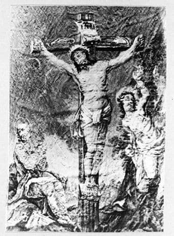 bannière de procession de la confrérie de saint Sébastien : le Christ en croix entre saint Sébastien et saint Joseph (?), Vierge à l'Enfant (œuvre volée)