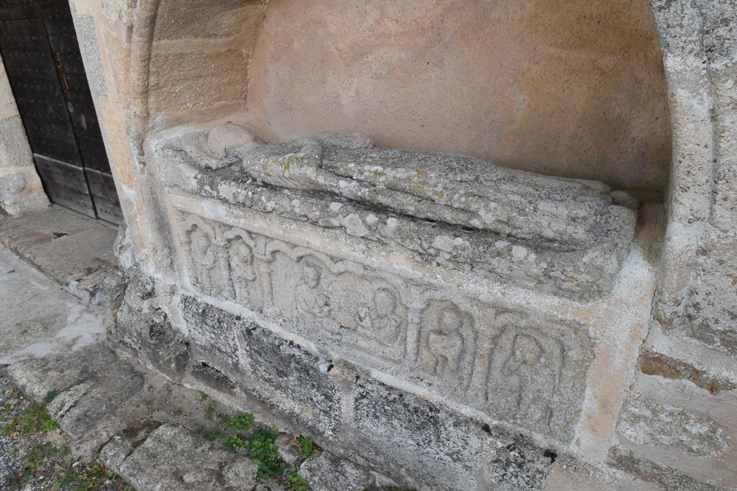 A l'intérieur de l'enfeu le tombeau est constitué par deux dalles : l'une verticale, à la base, sculptée en bas-relief, la seconde horizontale sur laquelle le gisant est sculpté en demi-relief.