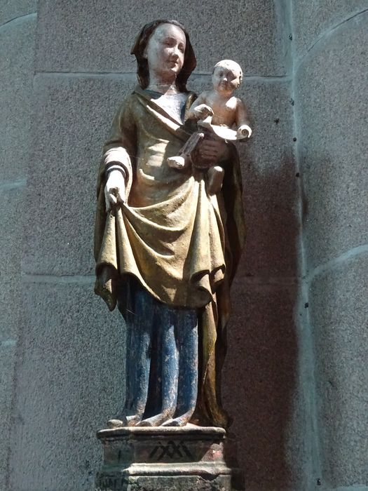 La Vierge est vêtue d'une simple robe bleue et d'un ample manteau drapé moutarde dont elle retient gracieusement un pan de la main droite. L'Enfant repose sur son bras gauche, torse nu et jambes croisées ; il déploie un phylactère. La diversité des plis des vêtements : en volute, ondulés, étagés, cassés au sol, confère à l'oeuvre un certain dynamisme.