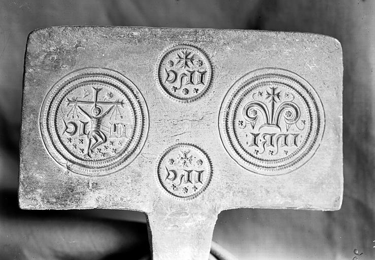 Fer composé de deux branches actionnant deux plaques rectangulaires dont l'une est gravée de deux grandes hosties et d'autant de petites.