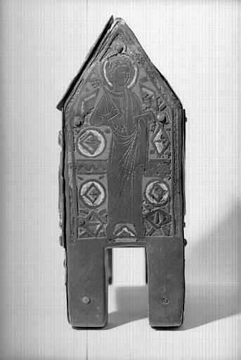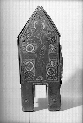 Les plaques de l'avers sont décorées de rinceaux en cuivre réservé sur fond d'émail bleu. A la caisse les trois figures du Calvaire sont rapportées. Au rampant, seuls subsistent les deux personnages d'applique qui encadraient un Christ bénissant d'applique, disparu, mais dont on distingue bien la silhouette en réserve. Les pignons présentent les figures de saint Pierre et de saint Paul sur fond émaillé semé de losanges. La plaque de la caisse au revers présente dans un lacis de rinceaux deux médaillons circulaires ornés d'anges à mi-corps. Les bandeaux latéraux sont décorés de rinceaux.