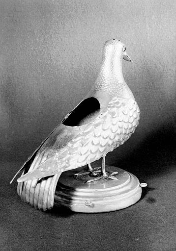 L'oiseau est constitué de trois plaques de cuivre assemblées par soudure : une pour la tête, une pour le ventre et, venant en recouvrement, une plaque pour le dos (où a été découpé l'orifice qui permet d'accéder à l'intérieur creux) ainsi que de deux plaques articulées formant les ailes. Les yeux sont constitués de petits verres rouges cerclés d'argent (?) Le bec est doré à la bronzine. Les pattes sont fixées sur un socle en bois doré mouluré de section circulaire, dont la tranche comporte des anneaux auxquels on attachait des chaînes de suspension en cuivre doré. Le dessus de la tête comporte neuf petits trous dont un au centre.