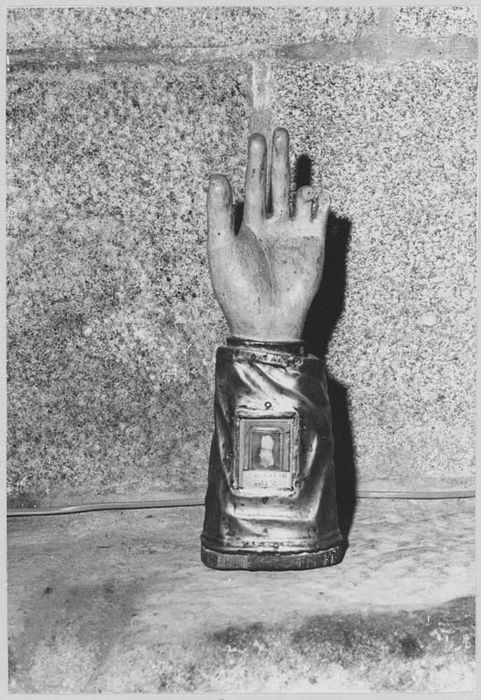 Bras-reliquaire formé d'une pièce de bois monoxyle et lisse, dont les deux tiers inférieurs sont recouverts d'une feuille de cuivre mise en forme au repoussé et clouée. La feuille de cuivre comporte un regard vitré rectangulaire devant la logette, de même forme mais plus petite, ménagée dans l'âme de bois.