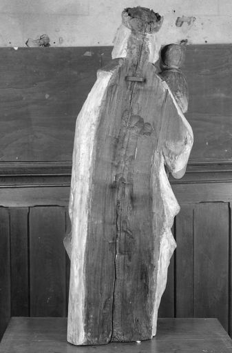 La statue ne présente plus de base car sa partie inférieure est tronquée. Le revers n'est pas travaillé et présente une surface légèrement évidée. Une poignée en fer de forme rectangulaire est rapportée dans la partie supérieure du dos. Le décor de la robe de la Vierge est gravé dans l'apprêt.