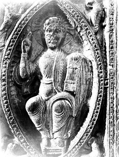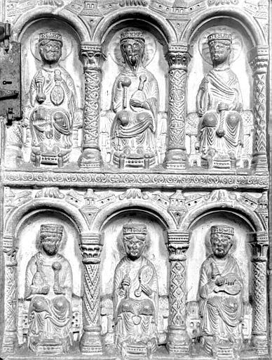 ornementation (à palmette, à perle, à pomme de pin, à rinceau, à médaillon, à arcature, à colonnette, chapiteau) ; acrotère ; Christ glorieux (le Tétramorphe, mandorle) ; ange ; Agneau de Dieu (croix grecque) ; Vieillards de l'Apocalypse ; Vierge à l'Enfant (assis, auréole, lys, Enfant Jésus : sceptre : ?, mandorle : ange)