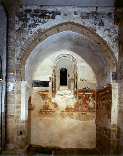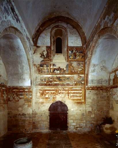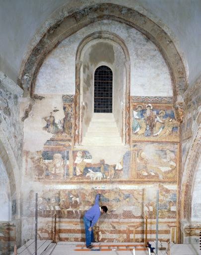 Ensemble de peintures murales partiellement connu depuis le 19e siècle. A part celles du choeur qui datent du début du 13e siècle, les peintures furent réalisées dans le dernier tiers du 12e siècle. Le Centre de recherche des Monuments historiques conserve un relevé de la Luxure, au revers de la façade occidentale, réalisé en 1991.