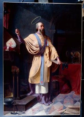 Le saint auréolé se tient près d'un pupitre sur lequel il appuie son coude droit et où est posée une mitre. Il pose son pied droit sur la marche du pupitre à proximité duquel figurent, à terre, une cuve, un marteau, des pinces et une plume. Dans la main droite il tient un stylet, dans l'autre une tablette de cire. Derrière lui, une crosse est posée sur un tapis rouge. A côté, sur une table recouverte par ce tapis rouge, sont disposés un triptyque, un reliquaire et un calice. A l'arrière-plan on distingue une porte en plein cintre.