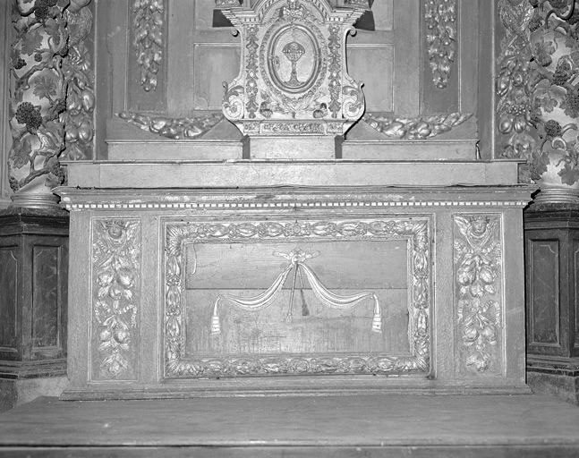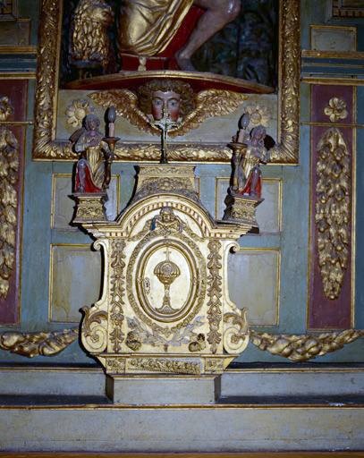 L'autel est couronné par une rangée de denticules. Le panneau central de la façade est encadré d'une large baguette dorée composée d'une riche guirlande de fleurons. Au centre est représenté un motif de draperie bordée de franges retenu par un fleuron et une cordelette à pompons. Les panneaux latéraux sont sculptés d'angelots retenant des chutes de fruits enrubannées. Les deux gradins superposés ne comportent aucune ornementation. L'armoire du tabernacle est prolongée par des ailerons à enroulement agrafés de feuilles d'acanthe. Au fronton de la façade figure un angelot. La porte est entourée de deux chutes de fleurs et de feuilles en bois doré, ce décor est complété par une bordure en laiton à motif de fleurs. Au centre de la porte est représenté un ciboire dont le couvercle est surmonté d'une croix. De part et d'autre du fronton, deux statuettes d'ange porte-flambeau sont rapportées sur des socles rectangulaires agrémentés d'un décor de laiton. Ils posent un genou à terre et inclinent la tête. Vêtus d'une tunique dorée à revers rouge, ils portent une main sur leur coeur et tiennent la tige des flambeaux dans l'autre.