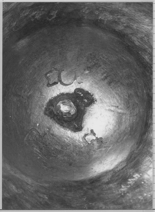 Au fond de la coupe : lettre R (Riom ou Rouen ?, poinçon de charge menus ouvrages 1781-1789) ; lettre C (?) couronnée ; un 3e poinçon illisible.