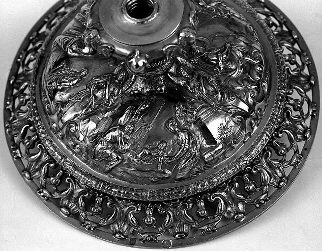 Sur l'ombilic de la patène : le Christ sortant du tombeau. Coupe du calice sans décor ; fausse-coupe du calice ajourée de volutes, guirlandes et acanthes ; noeud ovoïde représentant La Foi, l'Espérance et la Charité ; au-dessus et en dessous du noeud, bagues ornées de têtes d'angelots et de grenades ; sur le pied, 3 scènes séparées par des anges en termes : Annonciation, Visitation et Adoration des bergers ; sur la bordure du pied : feuilles d'eau et fleurons.