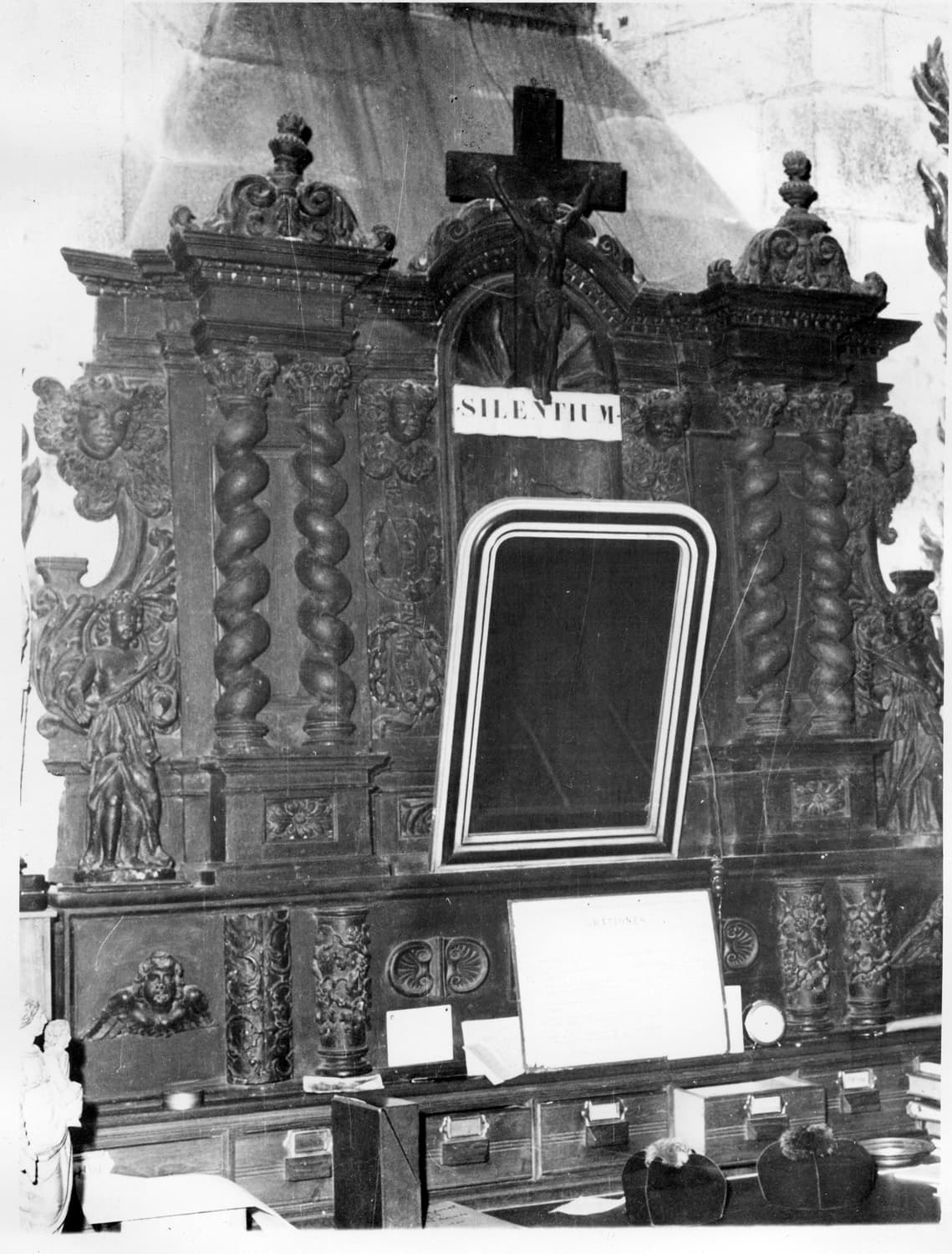 éléments de retable remontés, avec 2 statuettes d'anges
