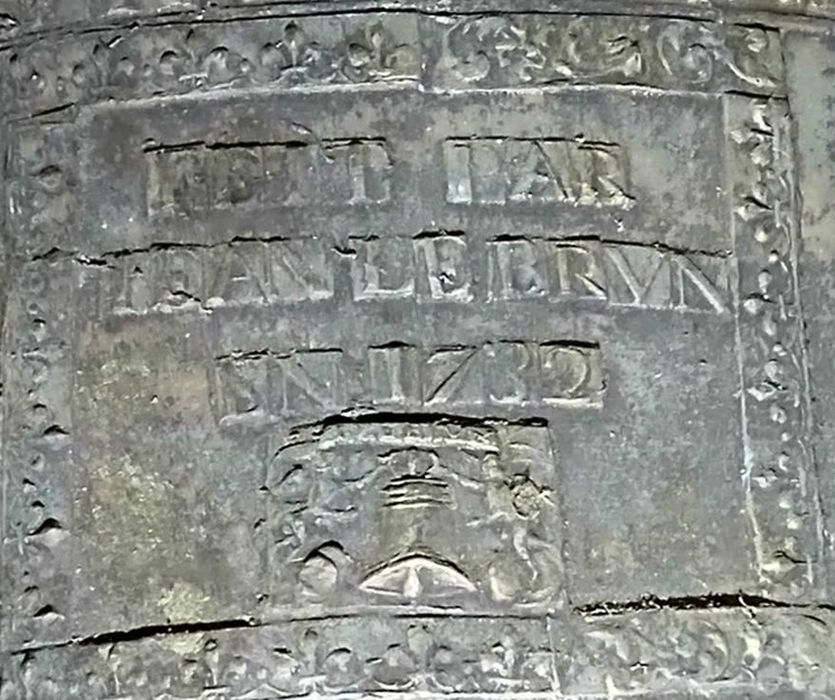 Inscription : + François de Bony, marquis de Lavergne, seigneur des Billanges, parrain, Louise Defarges, marquise de Lavergne, son épouse ; marraine. J'ai été bénite par M. Jean Fraisseix, curé de la paroisse, prieur d'Arennes. Antoine Delouis sindic fabricien ; signature et date : FAITE PAR JEAN LEBRUN / 1732.