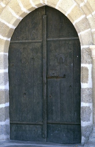 Vantaux formés chacun de trois planches verticales, renforcés par des barres de fer : 2 posées horizontalement en haut et en bas sur chaque vantail et une verticale au milieu. Un oeilleton (ou un trou laissé par un noeud du bois) est percé en partie basse du vantail gauche, entouré d'une petite plaque métallique. Des fers de différentes formes et tailles sont fixés sur les vantaux, 3 à gauche et 3 à droite (un grand, un moyen, un petit). Au milieu du vantail droit, une plaque métallique fixée par des clous à tête carrée est percée d'un trou de serrure au milieu et de deux quatre-feuilles le long du bord supérieur ; la tige du verrou coulisse en partie basse de cette plaque, maintenue par un crampon sans ornementation et une bague travaillée. Un bouton en forme de gland, fixé au-dessus de l'extrémité droite de la tige, en permet la manoeuvre, mais un autre bouton, au milieu de la tige, est cassé.