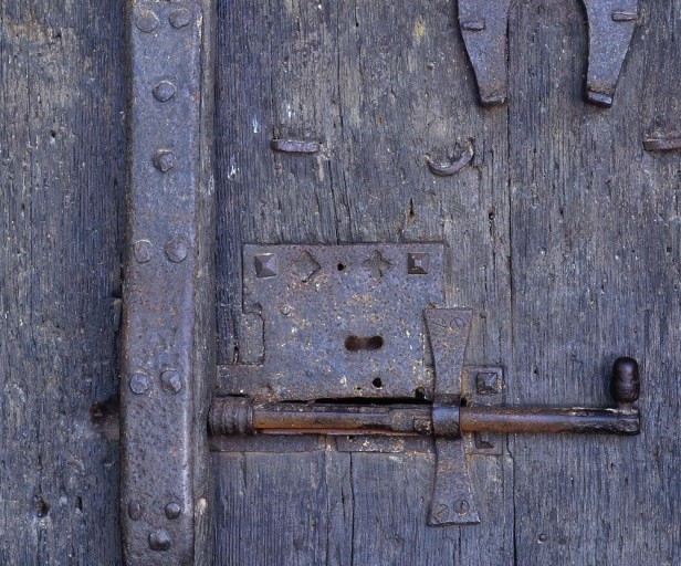 La plaque métallique de la serrure et du verrou a certainement été redécoupée et ne conserve plus grand chose de son apparence originelle. Les fers commencent à rouiller sous leur peinture de protection.