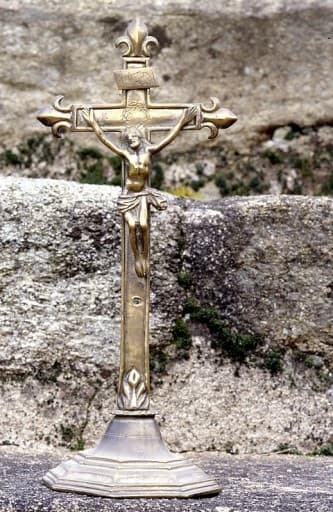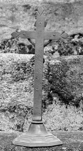 Croix fleurdelisée avec titulus et figure du Christ d'applique, fichée sur un pied octogonal. Couronne d'épines gravée à l'intersection des branches de la croix.