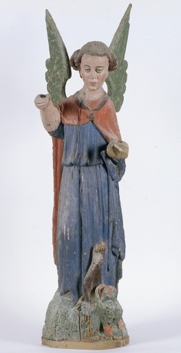 Ailes et avant-bras refaits, lance manquante. Longue fente longitudinale et importante vermoulure, surtout visible au dos et à la base de la statue (en partie masquée par la peinture ?).