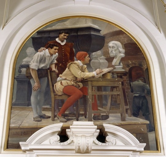 Cette allégorie veut représenter l'atelier de Léonard Limosin, célèbre émailleur du 16e siècle d'une dynastie limougeaude : l'artiste vêtu d'un costume Renaissance est assis devant une table sur laquelle est posé un buste qu'il copie, deux membres de l'atelier, debout derrière lui, l'observent. Derrière eux sont accumulés divers bustes et vases sur piédestaux, et un grand sarcophage de marbre noir surmonté d'un priant. A droite se trouve un four devant lequel s'affaire un ouvrier : il faut noter que le peintre a représenté là un four à globe pour la cuisson de la porcelaine, typique du paysage industriel de Limoges au 19e siècle.