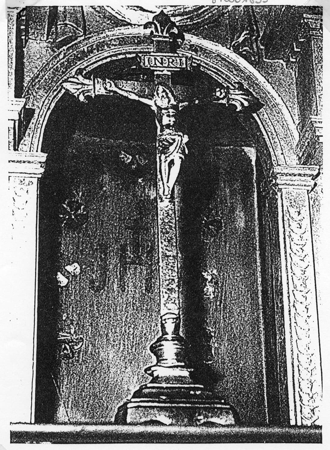 Croix fleurdelisée avec titulus et Christ d'applique, fixée sur un piétement tripode galbé.