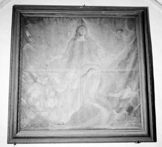 Tableau réalisé par Jean Laroche, peintre à Limoges, en 1676. Il s'agit d'une copie partielle de la partie haute du tableau d'autel de la chapelle du collège des jésuites de Limoges, attribué à Gérard Seghers (notice PM87000176) : la Vierge sur une nuée, les anges portant la nuée (à l'exception de celui du haut à gauche, omis), les nuées rayonnantes au-dessus de la Vierge (les trois angelots peuplant ces nuées ne sont pas conformes au modèle).