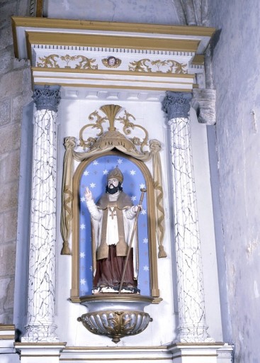 Retable, tabernacle et statues de la fin du 17e ou du début du 18e siècle. L'ensemble semble avoir été fortement remanié, et entièrement repeint, pour dégager la baie axiale et intégrer un maître-autel moderne dans les années 1900-1920.