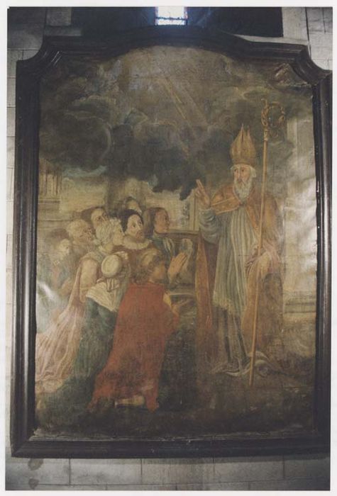 Tableau représentant saint Auvent et une famille de donateurs, daté 1768, et son cadre. Saint Auvent est un saint local (saint Audentius), fêté le 28 janvier.