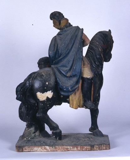 Ce groupe sculpté est clairement inspiré d'une gravure d'après Charles Le Brun. Une datation du 16e siècle est donc impossible, une datation du 17e siècle semble douteuse. Il date plus probablement des 18e et 19e siècles : importantes traces de réparations anciennes (cou et jambes du cheval), la tête du mendiant a très certainement été refaite par un sculpteur local.