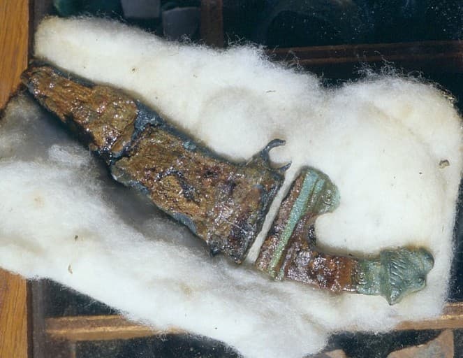 mobilier d'une tombe gallo-romaine : coffre et urne cinéraires, lacrymatoire, couteau, lampe
