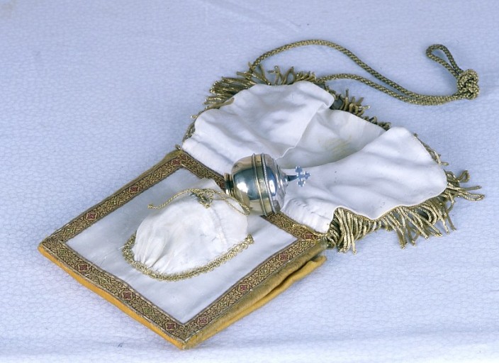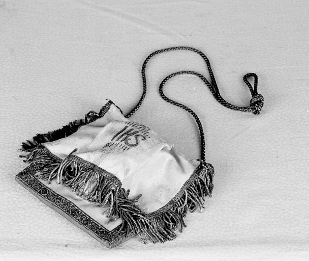 Croix au sommet du couvercle du ciboire. I.H.S. brodé sur le pan de la bourse.