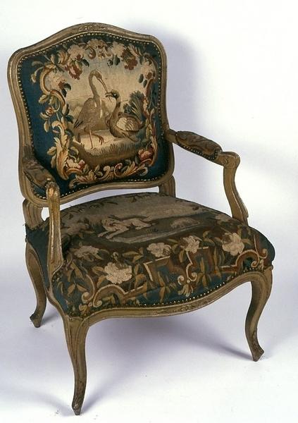 Selon un état des lieux rédigé en 1784, cet ensemble de fauteuils dits à la reine en tapisserie d'Aubusson 'à animaux' sont en place dans le salon 'de compagnie' du rez-de-chaussée ainsi qu'un ensemble de huit tapisseries provenant d'Aubusson (voir dossier : ensemble de huit pièces murales appartenant à une tenture des Jeux et divertissements).