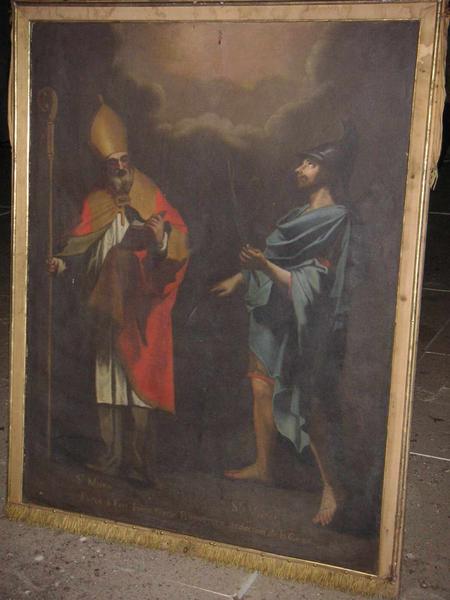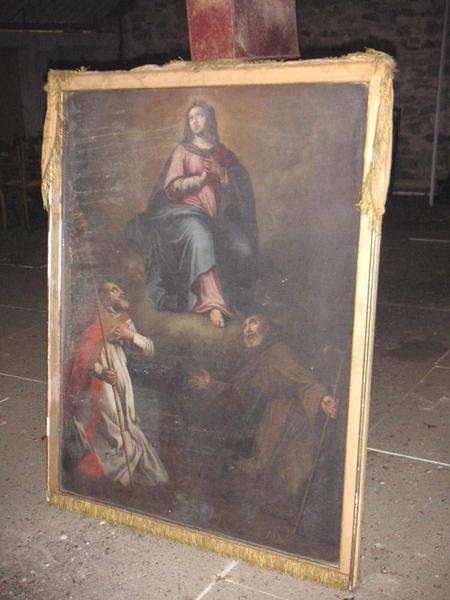 Le recto présente la Vierge assise sur des nuées, le regard levé au ciel ; elle est associée à deux saints en adoration : saint Thomas de Cantorbéry, évêque, à gauche et saint Antoine, abbé, à droite, vêtu d'une simple bure. Le verso Le recto présente la Vierge assise sur des nuées, le regard levé au ciel ; elle est associée à deux saints en adoration : saint Thomas de Cantorbéry, évêque, à gauche et saint Antoine, abbé, à droite, vêtu d'une simple bure. Le verso est illustré de deux grandes figures situées sur un même plan : saint Martin, évêque et saint Victor, vêtu d'un manteau-toge et d'un casque, tenant la palme de martyr. Ce dernier regarde un ciel empli de nuages gris qui se dispersent au centre de la toile pour laisser place à une auréole de lumière blanchâtre. La représentation est traditionnelle des scènes de ce genre où les cinq personnages semblent symboliquement s'ignorer les uns les autres.