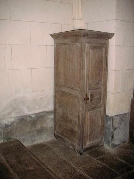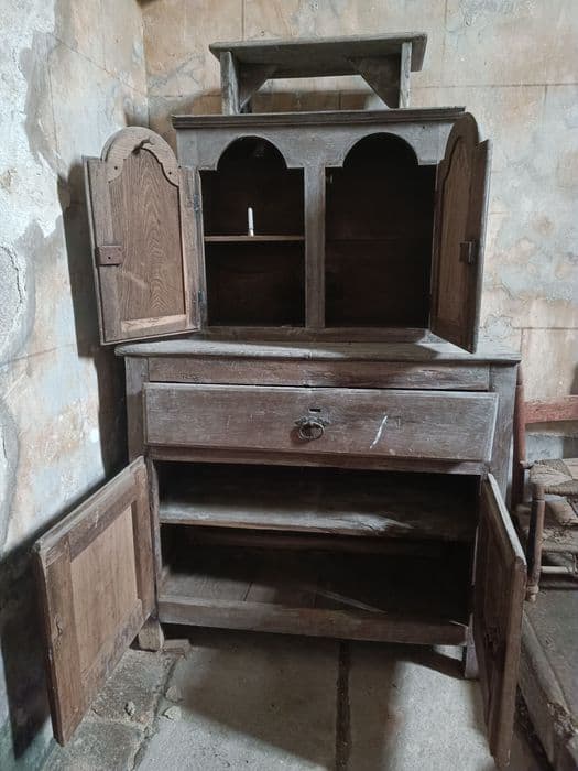 Le buffet est un meuble de facture rustique à usage liturgique ; la partie haute a un décor de moulures cintrées : elle provient d'un autre ensemble mobilier. L'armoire est à un seul corps et à un seul battant portant charnière et serrure. La corniche est très prononcée. Simple décor de panneaux moulurés. Meuble de facture rustique à usage de penderie pour vêtements liturgiques.