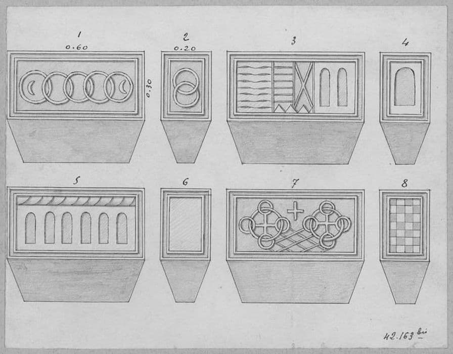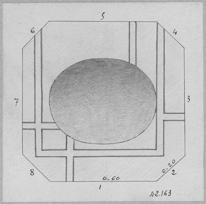 Bloc octogonal dans lequel est creusée une cuve ovale. A la partie inférieure ce bloc est taillé en biseau.