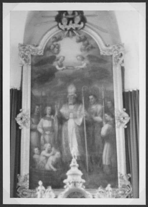 autel, retable, tabernacle, exposition, antependium, tableau et cadre : Saint Nicolas ressuscitant les trois jouvenceaux, 2 statues : Anges adorateurs (maître-autel)