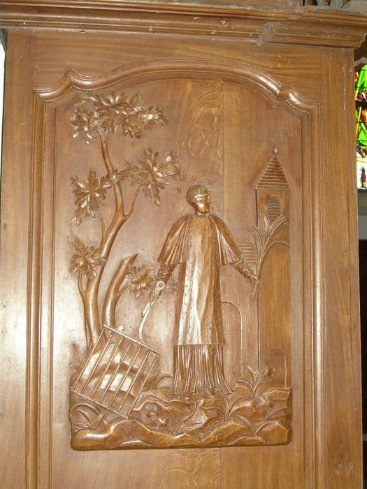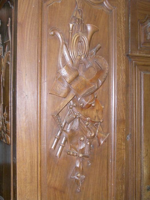 Larges panneaux à encadrement moulurés ornés des attributs liturgiques ou de musique et panneaux plus étroits ornés de relief en rocaille. Saint Laurent et saint Martin figurent sur les panneaux de retour de l'entrée.