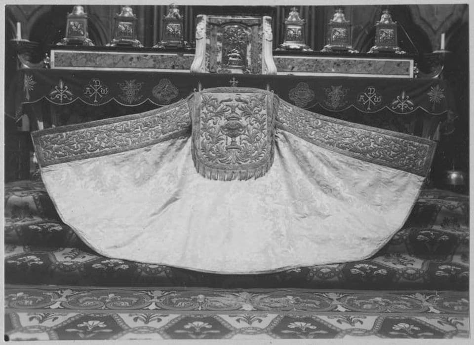 Cette chape est de soie blanche damassée bordée d'or. Elle est ornée, sur le devant, d'un orfroi d'or brodé et, sur le derrière, d'un large chaperon lui aussi brodé et frangé d'or.