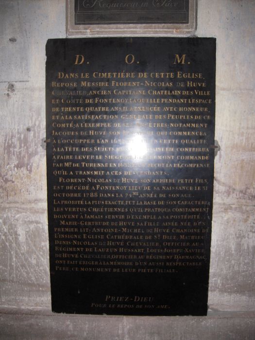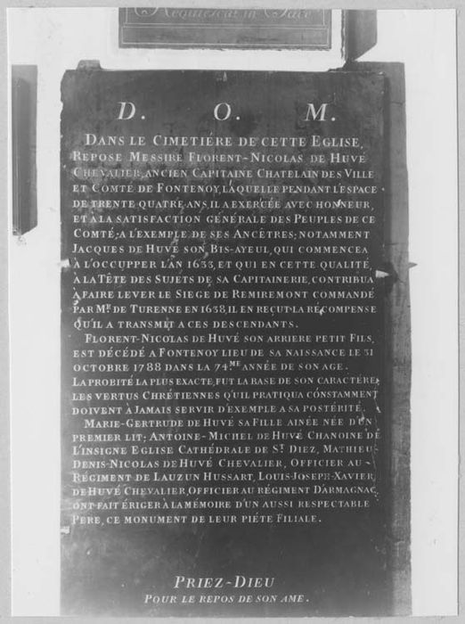 Cette plaque est apposée à l'initiative des enfants du défunt, Marie-Gertrude de Huvé, sa fille aînée d'un premier lit, d'Antoine-Michel de Huvé, chanoine de l'insigne église cathédrale de Saint-Dié, Mathieu-Denis-Nicolas de Huvé, officier au régiment de Lauzun hussards, Louis-Joseph-Xavier de Huvé, officier au régiment d'Armagnac.