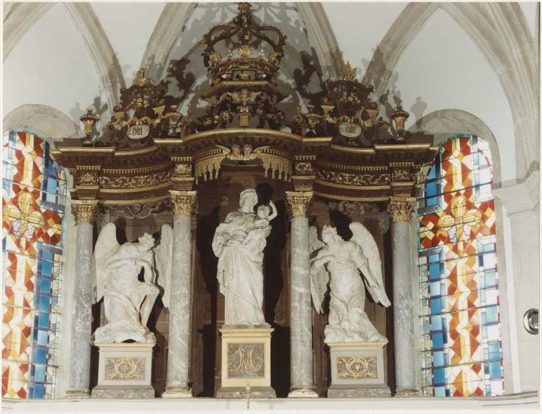 Retable à colonnes de marbre et corniche en bois, orné de trois statues, grandeur nature, la Vierge portant l'Enfant et deux anges agenouillés.