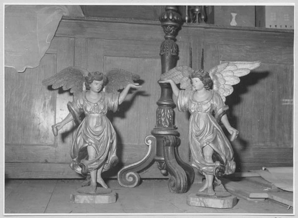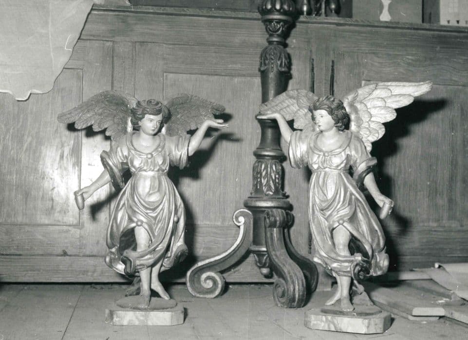 Les deux statuettes ont une attitude symétrique et devaient faire partie d'un maître-autel disparu.