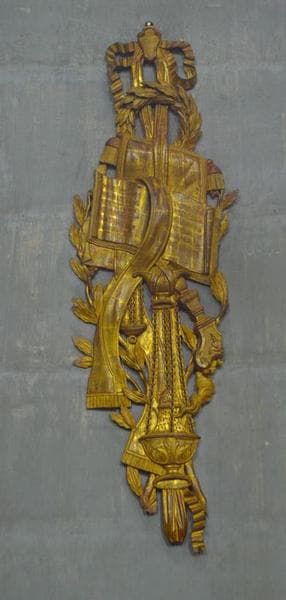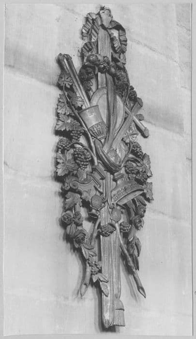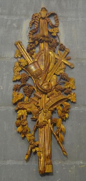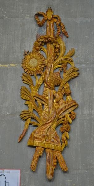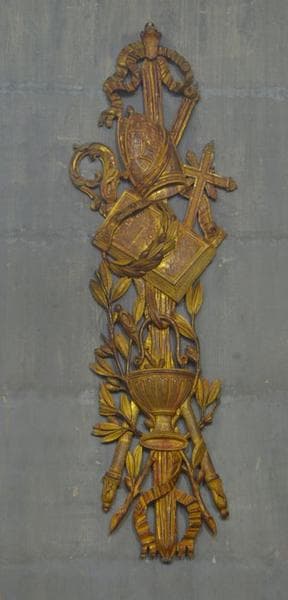 Les quatre trophées présentent la même typologie. Sur une tige centrale, ou ruban vertical, servant d'axe, divers motifs pâramentiques sont sculptés. Au sommet y est noué un ruban.£Le premier trophée présente en arrière plan deux bâtons deprocession se croisant, au sommet desquels sont représentées une crosse, à dextre, et une croix liturgique, à senestre. Au niveau de ces motifs sont figurés une mitre d'évêque à l'arrière de laquelle, à senestre, se dressent deux bâtonnets surmontés d'anneaux. Au-dessous, une couronne de lierre est posée sur le bord supérieur dextre d'un livre liturgique, peut-être un bréviaire, orné de motifs floraux gravés. Un bénitier en forme de coupe contenant un goupillon est suspendu à un ruban de tissu, et entouré de branches de lierre.£Le deuxième trophée présente, dans sa partie supérieure, une couronne de lierre encerclant la tige centrale. Sous celle-ci vient se placer un coussin. Il possède deux pompoms, un à dextre et au autre à senestre. Un graduel, recueil de chants grégoriens chantés pendant la messe, est posé dessus. Ouvert, nous pouvons voir sur ce dernier une partition de chants grégoriens. Du livre liturgique tombent un manipule, une navette ainsi qu'un encensoir. Il est entouré de part et d'autre par des branches de lierre.£Le troisième trophée présente une couronne de fleurs dans la partie septentrionale. Au milieu du trophée se croisent un ciboire et un ostensoir. Au centre de ce dernier une inscription est présente : IHS surmonté d'une croix. Il s'agit de l'abréviation ou translittération imparfaite des trois premières lettres du mot JESUS en grec. Pour la tradition catholique il s'agirait du raccourci du sigle de l'empereur Constantin qui aurait entendu en voyant une croix dans le ciel 'par ce signe tu vaincras'. dans la partie inférieure du trophée, un manipule ceinture la tige centrale. Enfin, des épis de blés et une banderole de fleurs à senestre, entourent la composition.£Le quatrième trophée présente également une couronne de fleurs dans sa partie supérieure. De part et d'autre d'une patène se trouvent un énorme calice et une croix liturgique. Sous ces derniers, deux burettes sont suspendues. Ces éléments paramentiques sont entourés de grappes de raisins et de banderoles de fleurs.