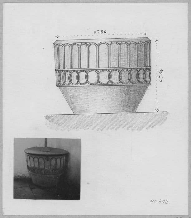 Cuve baptismale ronde, ornée d'arcades en plein cintre et de cercles de pénétrant.