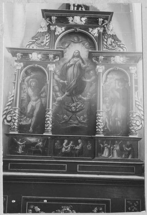 Ce retable est divisé en trois panneaux surmontés d'arcatures, sur le panneau central l'Assomption de la Vierge, sur celui de droite saint Roch, sur celui de gauche Saint Sébastien. La prédelle comporte également trois sujets : la salutation angélique, la présentation de Jésus à sainte Anne, les saints Rémi, Claude et Fiacre.
