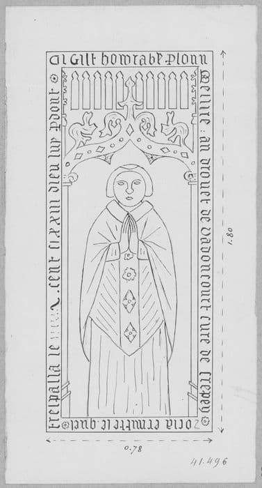 A effigie gravée d'un prêtre les mains jointes sous une arcade ogivale.