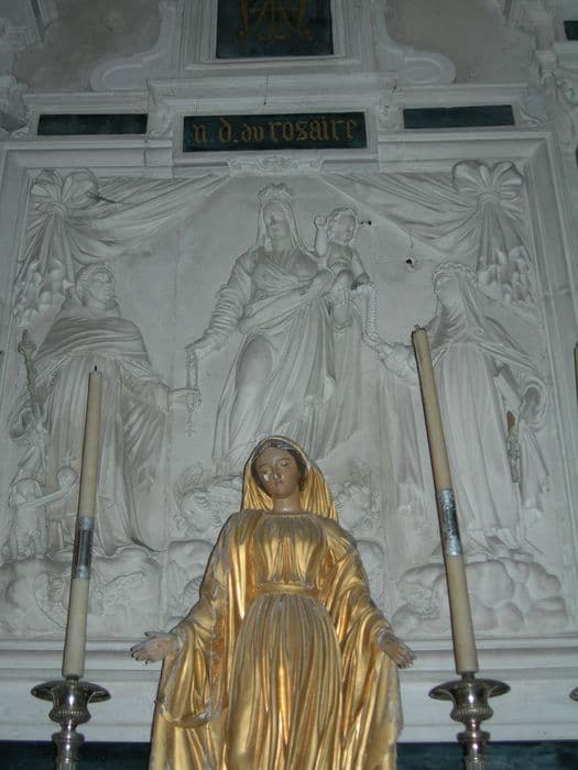 autel de Notre-Dame du Rosaire, haut-relief : la Vierge tenant le Rosaire d'une main et l'Enfant de l'autre, accompagnée de saint Dominique et sainte Catherine de Sienne