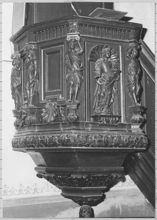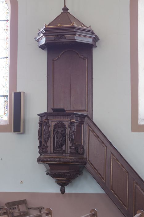 Cette chaire provient de l'ancienne église antérieure au 18e siècle. La partie la plus ancienne est représentée par la cuve. L'escalier et l'abat-voix sont du 18e siècle.