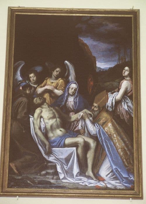 tableau et cadre : la Déploration du Christ en présence d'un évêque et d'un moine franciscain
