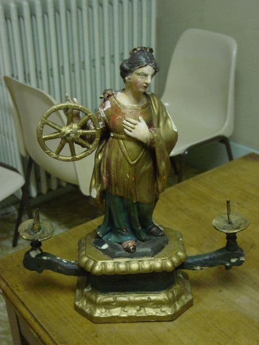 bâton de procession de confrérie surmonté d'une statuette de sainte Catherine