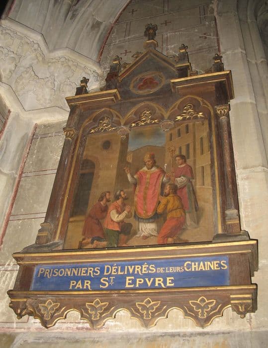 POP | Plateforme ouverte du patrimoinesix tableaux de la vie de saint Epvre et leurs cadres : Saint Epvre enfant donnant son manteau à un pauvre, Saint Epvre priant pour la délivrance de trois prisonniers, Les prisonniers délivrés de leurs chaînes par saint Epvre, Saint Epvre exorcisant un possédé, Mort de saint Epvre, L'Apothéose de saint Epvre