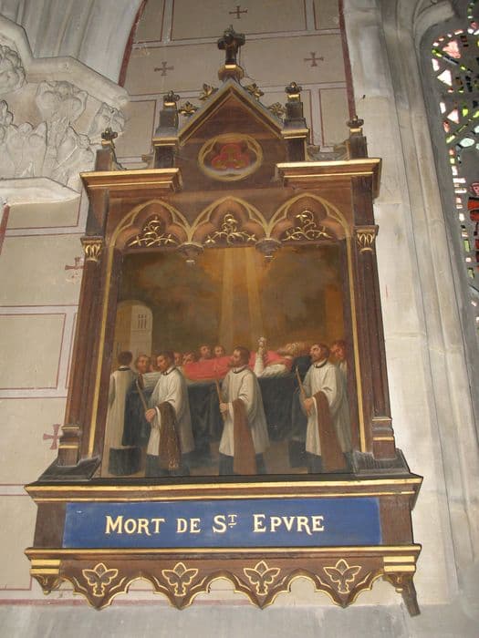 six tableaux de la vie de saint Epvre et leurs cadres : Saint Epvre enfant donnant son manteau à un pauvre, Saint Epvre priant pour la délivrance de trois prisonniers, Les prisonniers délivrés de leurs chaînes par saint Epvre, Saint Epvre exorcisant un possédé, Mort de saint Epvre, L'Apothéose de saint Epvre